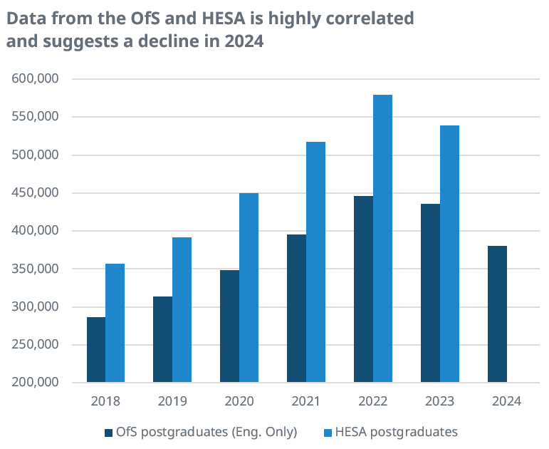 Data from the Office of Students also has its limitations though. Covering England only, the data is defined as early estimates, so it does not represent the final full-time student population. However, it does appear to be highly correlated to HESA, helping to provide an indication of how trends have developed since the latest reported year.