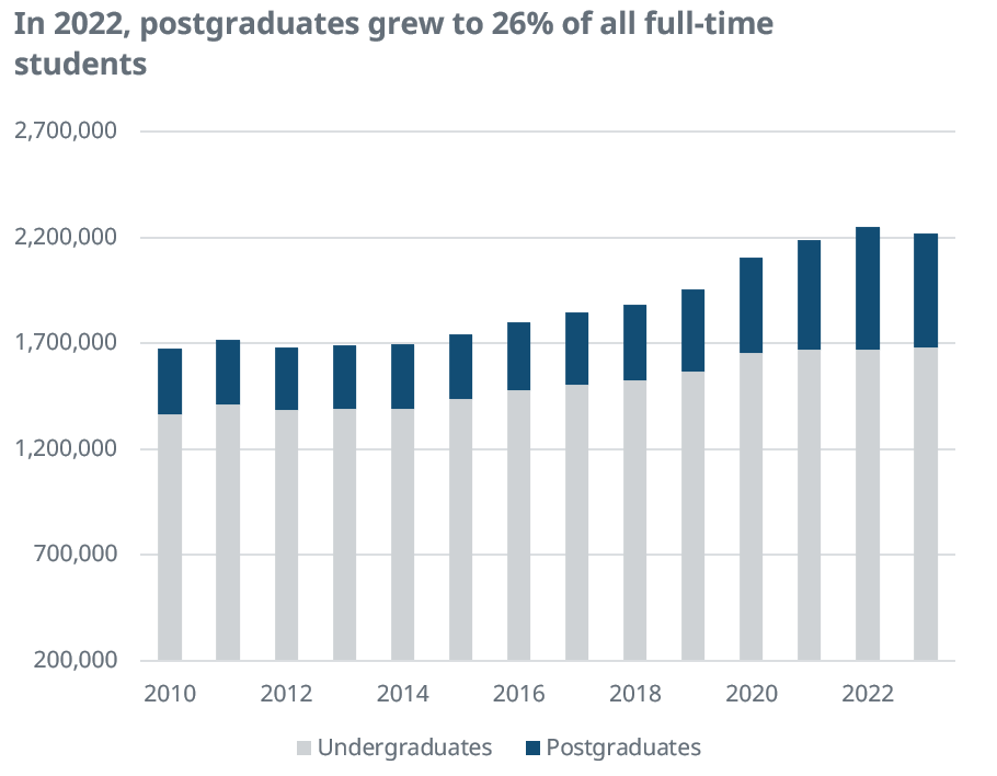 In recent years, postgraduates have become an increasingly important cohort. While the lack of timely data from HESA is well-reported, it does show how this student group grew from less than 19% share in 2018 to ~26% in 2022. What’s more, most of this was attributed to international (non-EU) growth, with numbers increasing by >220k during this period. Total undergraduates over the same period grew by ~144k.