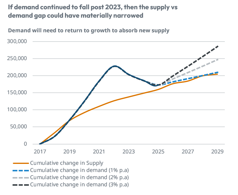 The spread between supply and demand ballooned post-COVID, resulting in extremely strong leasing performance and double-digit rental growth. However, this was not sustained, and analysis based on the above now suggests figures in 2025 are closer to those reported in 2018 or 2019.