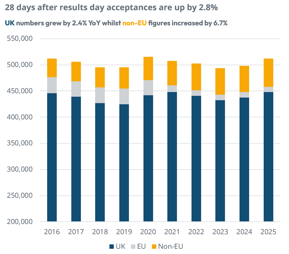 Total yearly acceptances grew by 2.8% to 512,270. At a domicile level, acceptances from UK students were up by 2.4%, while non-EU figures jumped by 6.7%. The position 28 days after results day was therefore mostly positive.