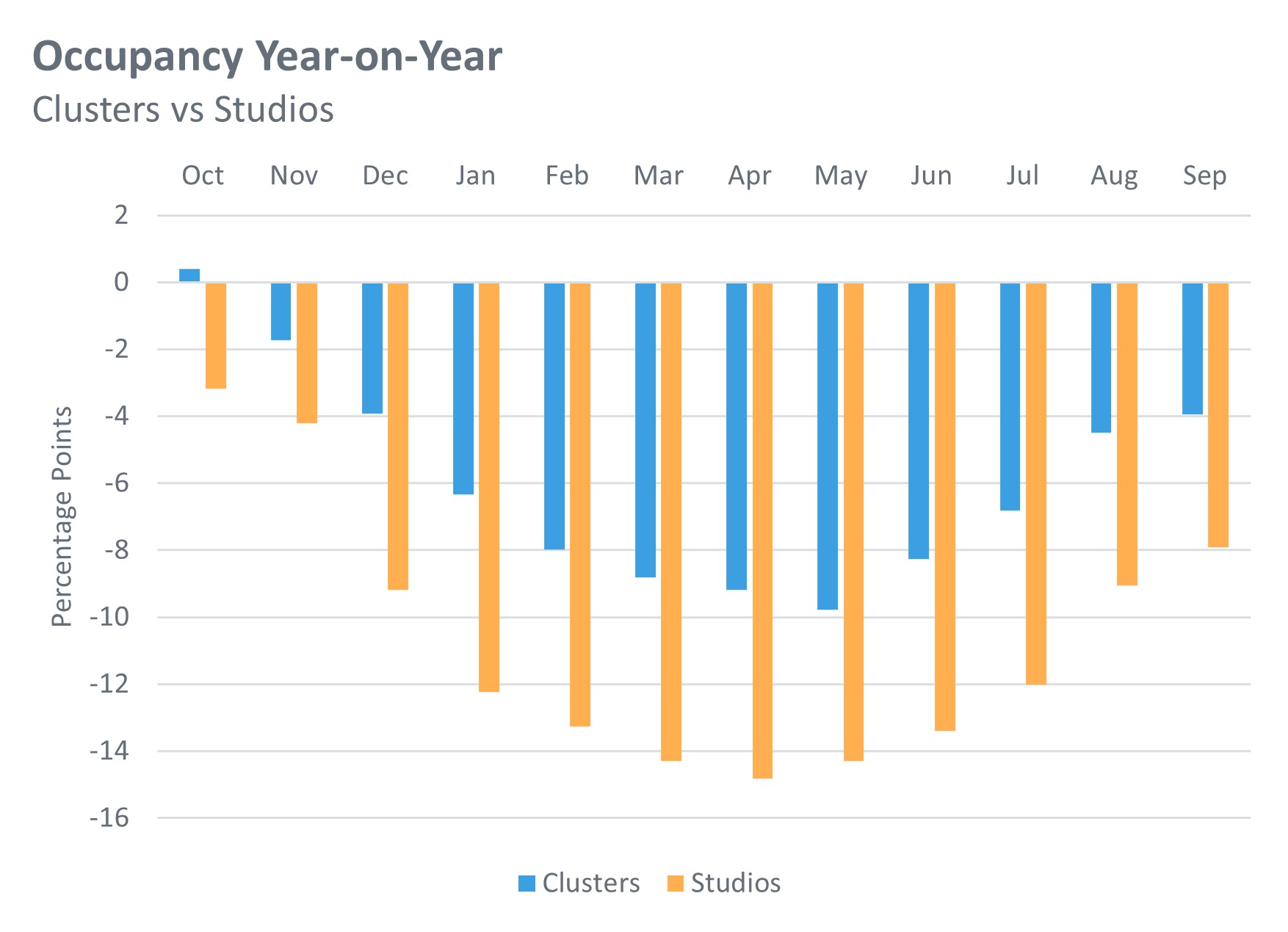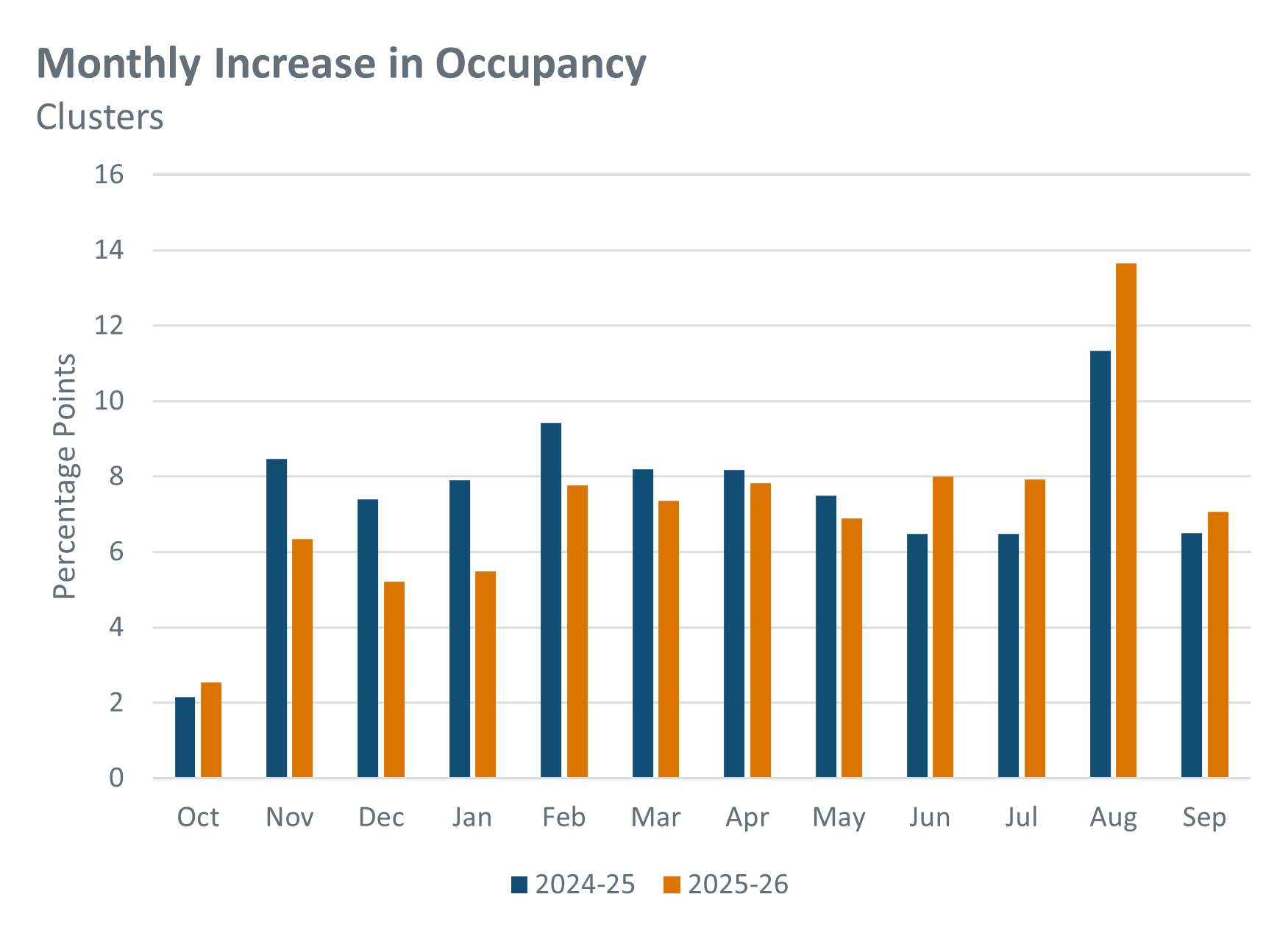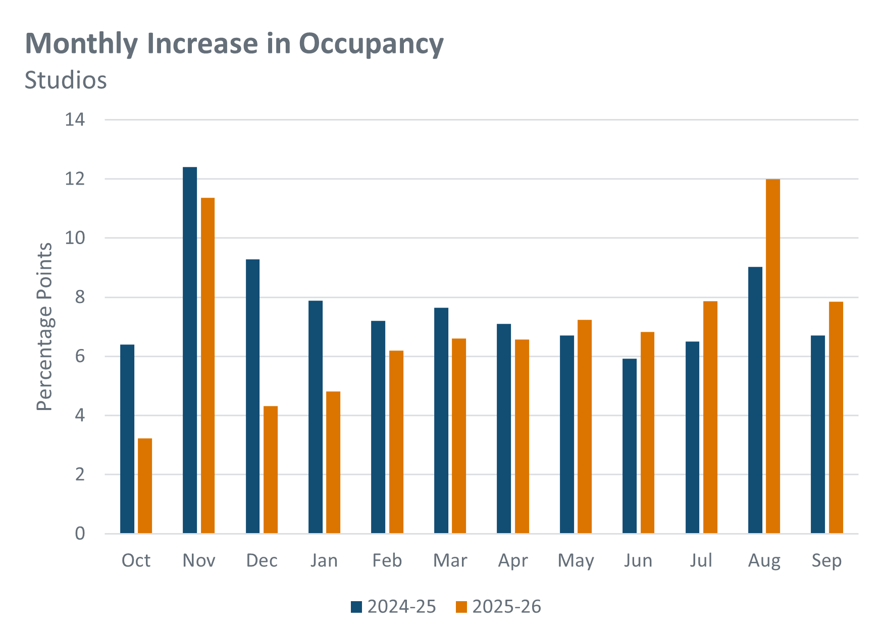 The above is showing how the YoY gap in bookings has changed throughout the cycle, for both cluster beds and studios. Clusters hit a low point of 9.8 points down in May, while studios’ nadir came a month earlier in April - down 14.8 points vs the same point in the 24-25 cycle. Both bed types increased in velocity during the summer, with clusters finishing 3.9 points down YoY and studios finishing 7.9 points down YoY.