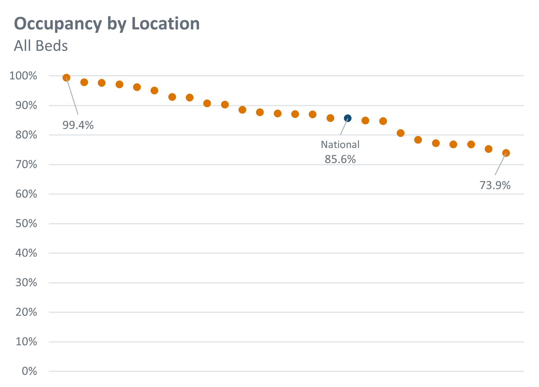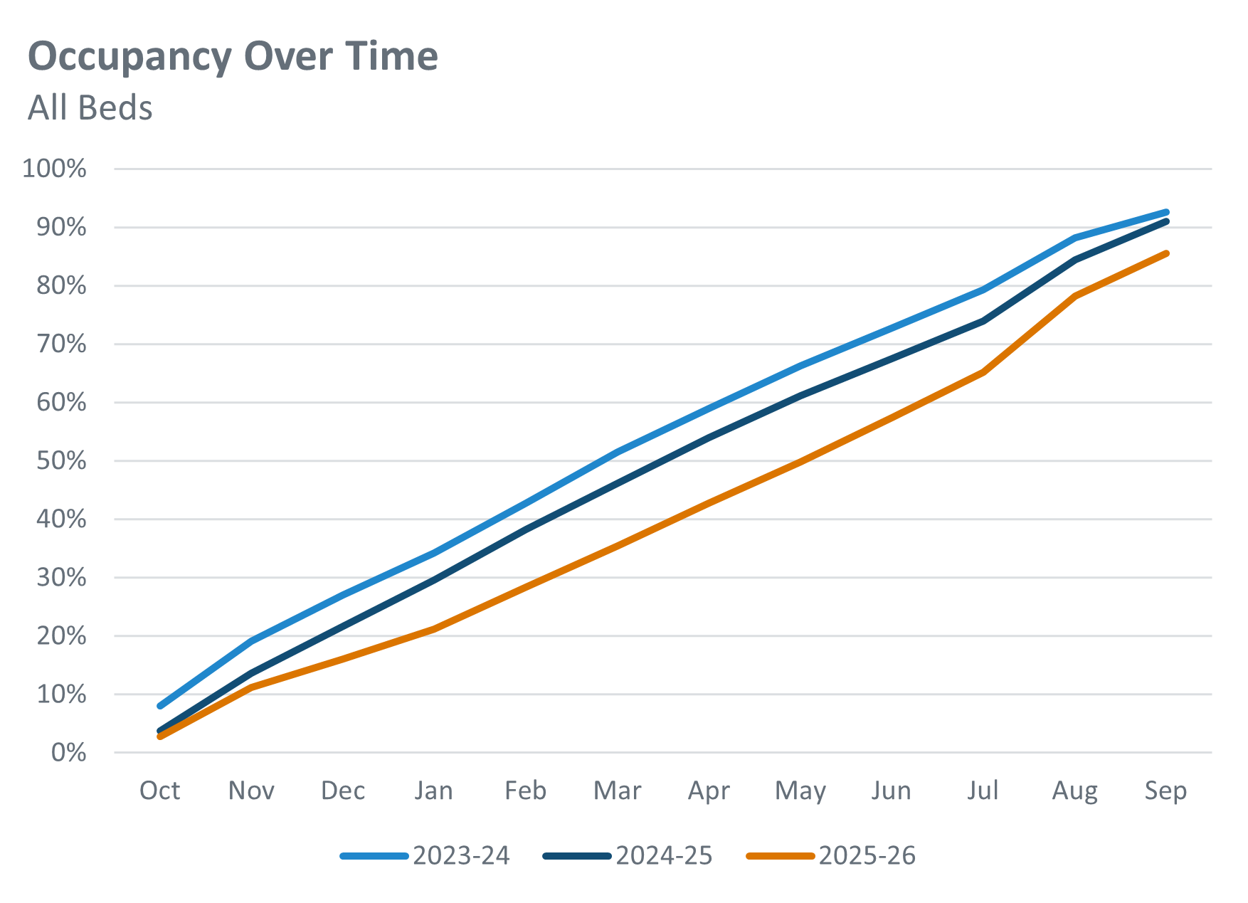 The above chart shows how 25-26 leasing velocity consistently lagged behind that of the two previous years. While bookings picked up considerably in the summer months, it wasn’t enough to close the gap. Across all bed-types in all 25 locations we cover, average occupancy stood at 85.6% as of the end of September. This represents a 5.4 percentage point drop in occupancy year-on-year (YoY).